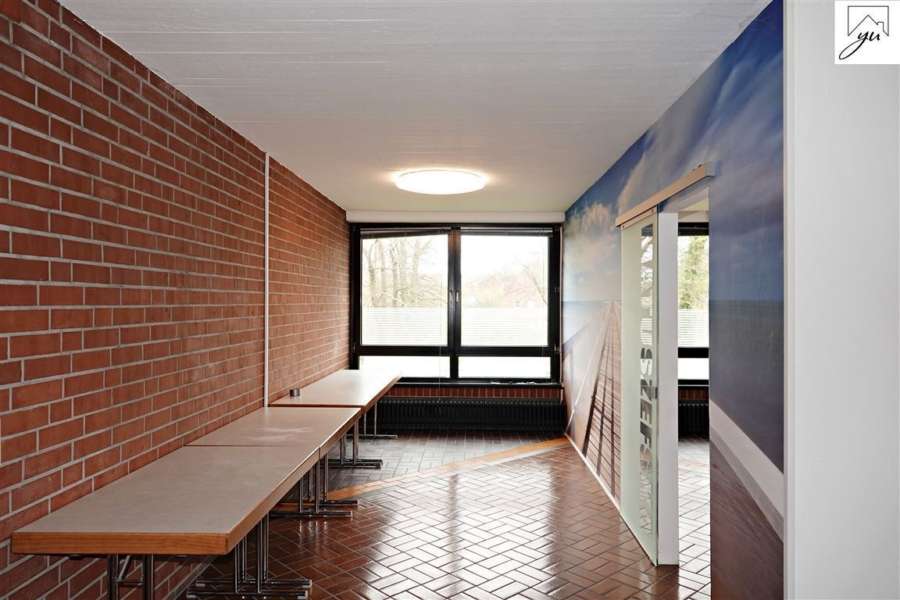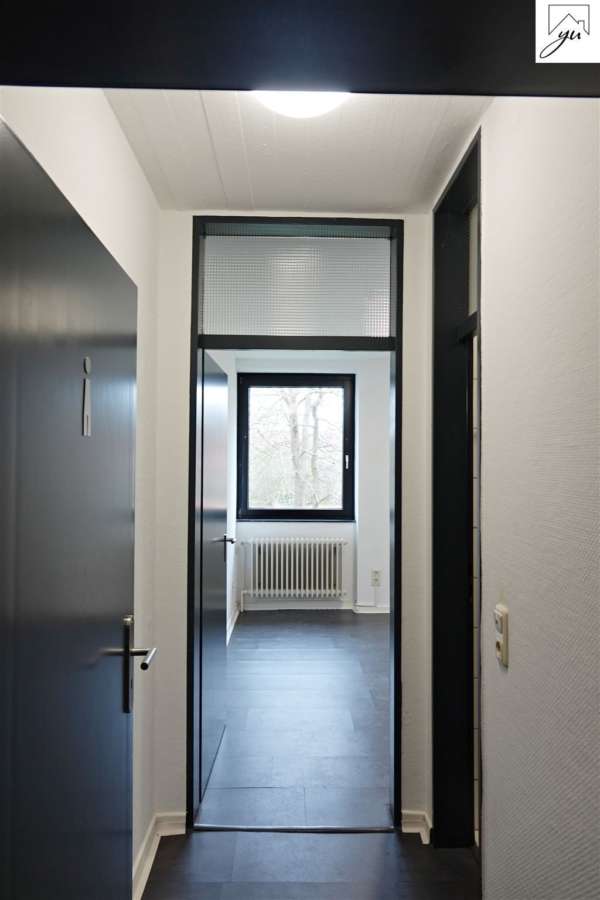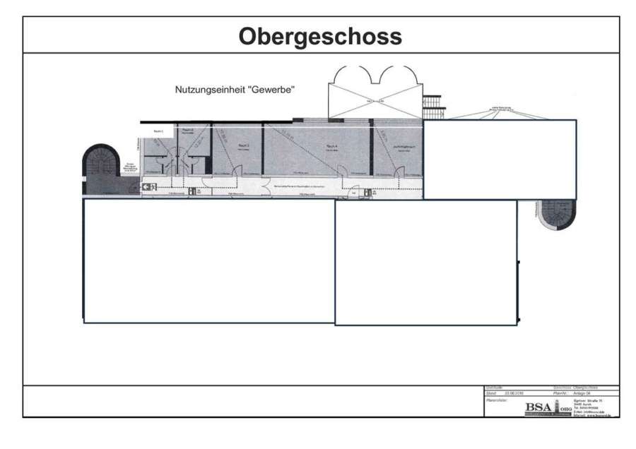 Im Obergeschoss des Wohn- und Geschäftshauses befindet sich eine Gewerbefläche mit separatem Eingang. Diese teilt sich auf in einen Eingangsbereich, einen großen Flur mit Möglichkeit für einen Wartebereich, zwei große Büroräume und zwei Badezimmer mit anliegenden Umkleide- oder Aufenthaltsräumen. Im großen Flur wurde eine zusätzliche Raumabtrennung hinzugefügt, welche bestehen bleiben, oder aber auch ausgebaut werden kann.