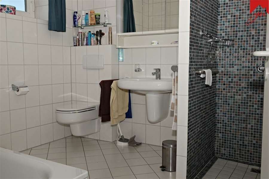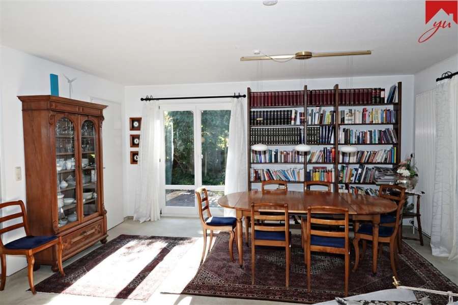 ein einladender Hauseingangsbereich mit separater Garderobe, eine Küche mit ansprechender Einbauküche und Zugang zur Terrasse sowie zum offenen Wohn- und Esszimmer, von welchem Sie ebenfalls direkten Zugang zu einer weiteren Terrasse mit Markise haben, einem Büro, einem Schlafzimmer mit angrenzendem Dusch- und Wannenbad, einem Gästezimmer, einem Gäste- WC mit ebenerdiger Dusche, einem kleinen Vorratsraum sowie einem Hauswirtschaftsraum mit Waschmaschinenanschluss und direktem Zugang zum Garten.