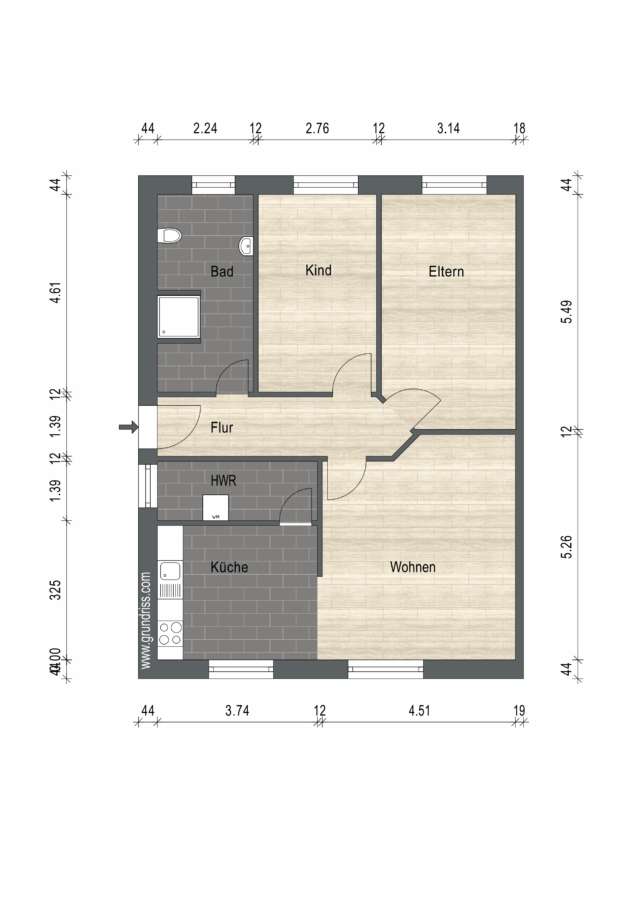 Der Grundriss dieser schönen Bungalowhälfte teilt sich auf in: