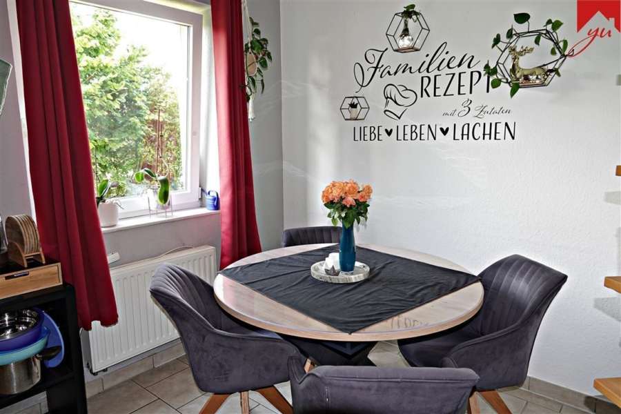 einen Eingangsbereich und Flur, eine gemütliche Küche und Einbauküche mit einem Essbereich, einem geräumigen Wohnzimmer, Hauswirtschaftsraum mit Waschmaschinenanschluss und einem Gäste- WC im Erdgeschoss.