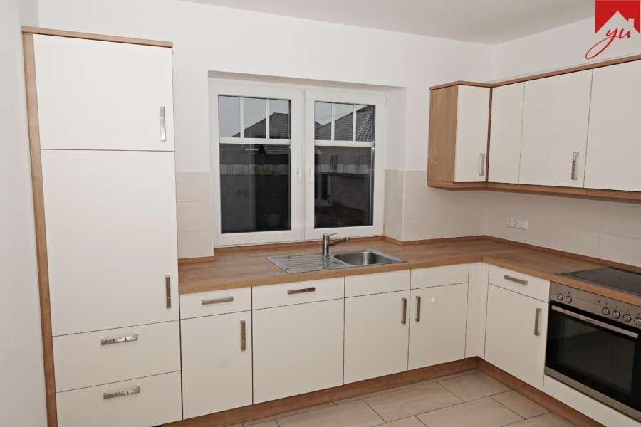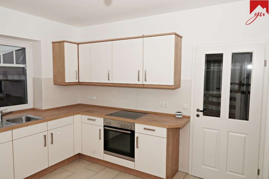 eine Küche mit neuwertiger Einbauküche und Platz für einen Essbereich, einen großes Wohnzimmer ebenfalls mit Patz für einen Essbereich sowie Zugang zur Terrasse und zum Garten, ein praktischer Hauswirtschaftsraum, ein Gäste-WC und ein Flur im Erdgeschoss.