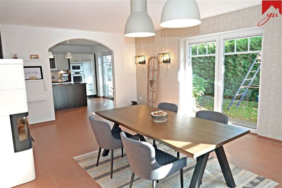 Im Erdgeschoss befindet sich ein offener, einladender Eingangsbereich, eine offene Küche mit hochwertiger Einbauküche sowie direktem Zugang zum Garten und zur angrenzenden Speisekammer, ein offenes Esszimmer mit gemütlichem Kaminofen sowie Zugang zur überdachten Terrasse, ein gemütliches Wohnzimmer, ein modernes Gäste- WC mit Dusche und einem Hauswirtschaftsraum mit direktem Zugang nach Draußen.