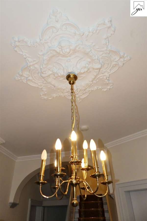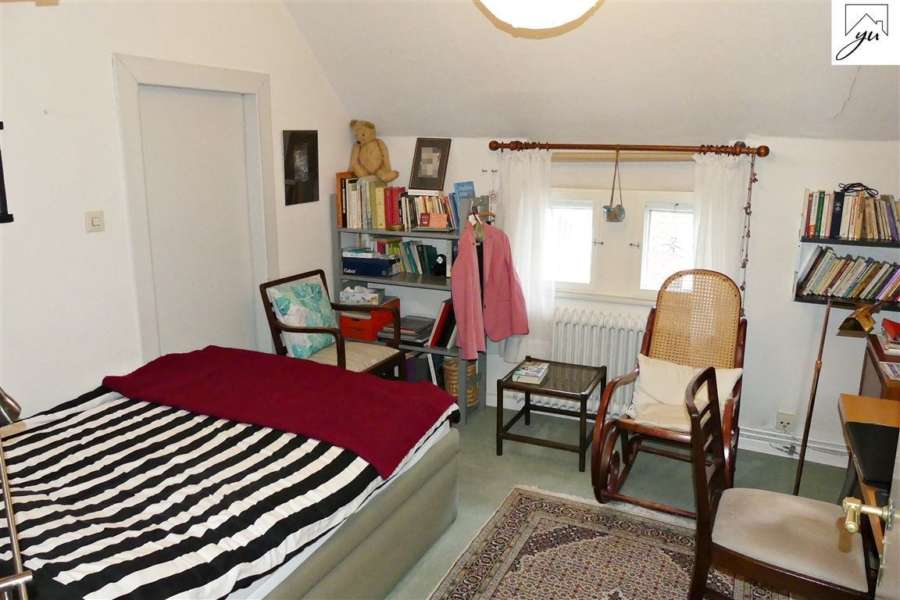 Die Wohneinheit im Obergeschoss teilt sich wie folgt auf: einen offenen Flurbereich, eine Küche mit Einbauküche, einem gemütlichen Esszimmer, einem Schlafzimmer mit direktem Zugang zum sanierten Badezimmer, einem Kinderzimmer, einem kleinen Büro, einem Wohnzimmer, einer Zubereitungsküche, einem Wannenbad, einem Duschraum und einer separaten Toilette sowie ausreichende Abstellmöglichkeiten. Die schöne Dachterrasse mit Blick auf den stilvoll angelegten Garten ist vom Flur aus zu erreichen. Der Dachboden bietet weitere Staumöglichkeiten.