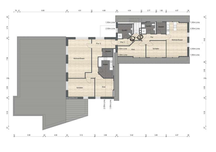 Wohnung 6: Diese Wohnung im Obergeschoss ist die größte Einheit in dem Sechsfamilienhaus und erstreckt sich auf 99 m² Wohnfläche. Aufgeteilt ist diese in eine gemütliche Küche mit moderner Einbauküche, ein geräumiges Wohnzimmer, ein Schlafzimmer, eine Diele, ein Büro oder Gästezimmer, ein modernes Badezimmer mit Dusche und Wanne und einen Hauswirtschaftsraum mit Waschbecken.