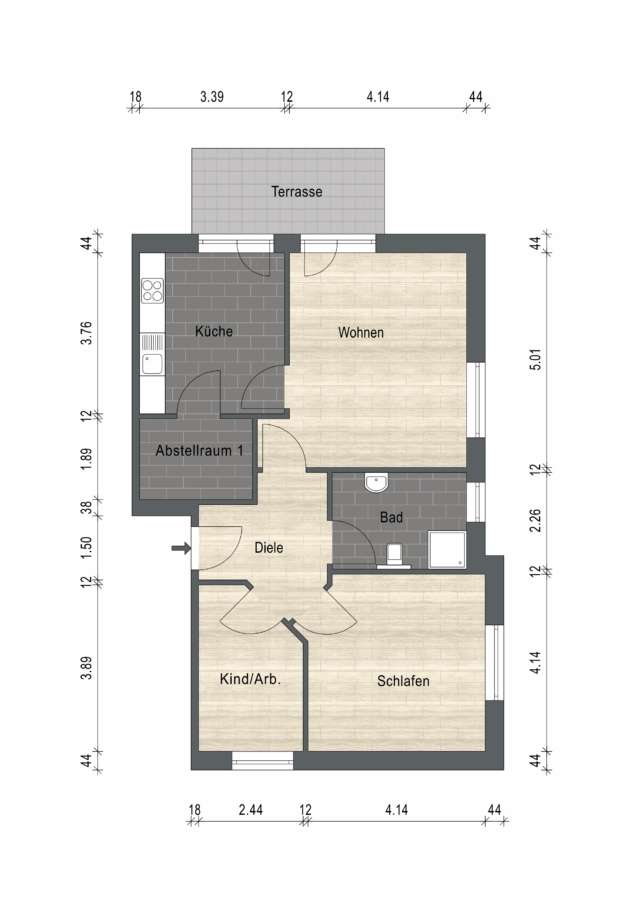 einen einladenden Wohnungseingangsbereich, ein gemütliches Wohnzimmer mit Zugang zur Terrasse, einer Küche mit Einbauküche und Zugang zum Hauswirtschaftsraum mit Waschmaschinenanschluss sowie Zugang auf die schöne Terrasse mit Garten, ein geräumiges Schlafzimmer, ein Gästezimmer oder Büro und ein Badezimmer mit ebenerdiger Dusche.