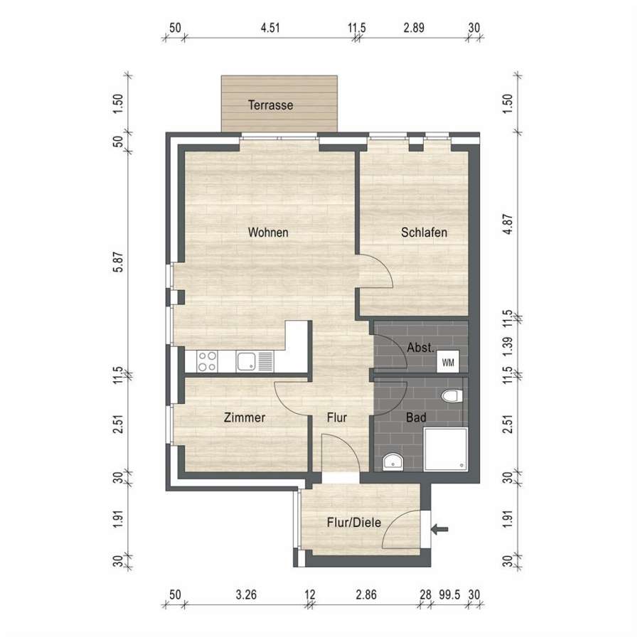 Aufgeteilt ist die Wohnung in einen Wohnungseingangsbereich, eine offene Küche, ein Wohn- und Esszimmer mit Zugang zur Terrasse, ein Schlafzimmer, ein Gästezimmer oder Büro, ein Badezimmer mit Dusche und einen Abstellraum mit Waschmaschinenanschluss.