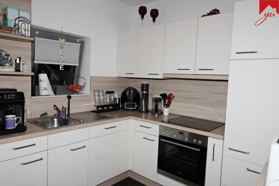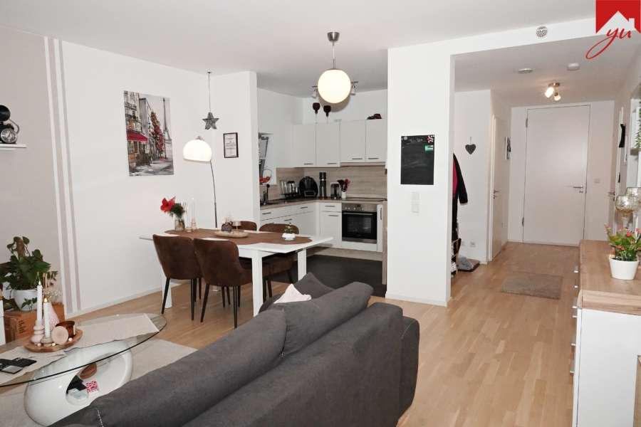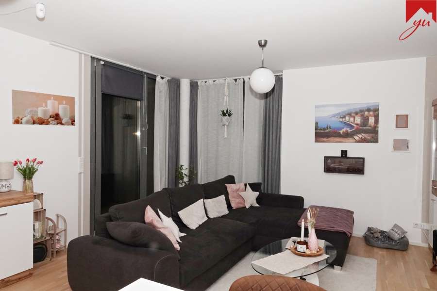 Die Wohnung hat einen offenen und hellen Grundriss und bietet ein geräumiges Wohn- und Esszimmer mit einem Küchenbereich inkl. ansprechender Einbauküche sowie Zugang zu einem überdachten Balkon, ein großes Schlafzimmer, ein modernes Badezimmer mit ebenerdiger Dusche sowie einen praktischer Abstellraum mit Waschmaschinenanschluss und ausreichend Stauraum.