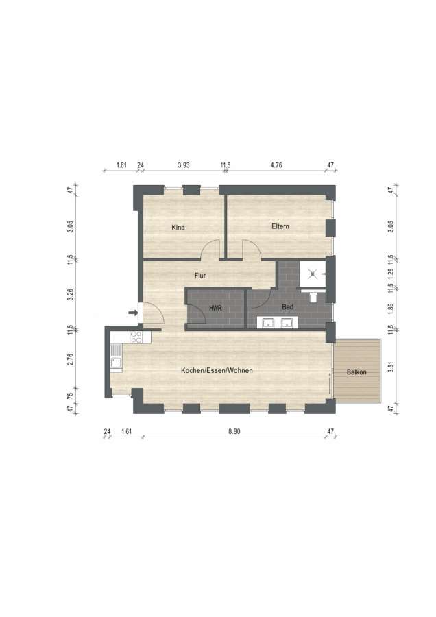einen einladenden Wohnungseingangsbereich, einen hellen und lichtdurchfluteten Wohn- und Essbereich mit offener Küche inkl. ansprechender Einbauküche, ein geräumiges Schlafzimmer, ein Büro/Gästezimmer, ein modernes Badezimmer mit ebenerdiger Dusche und einen praktischen Hauswirtschaftsraum mit Waschmaschinenanschluss.