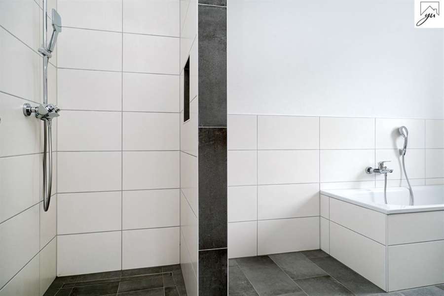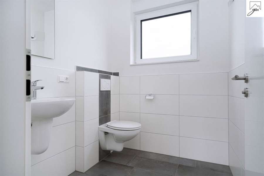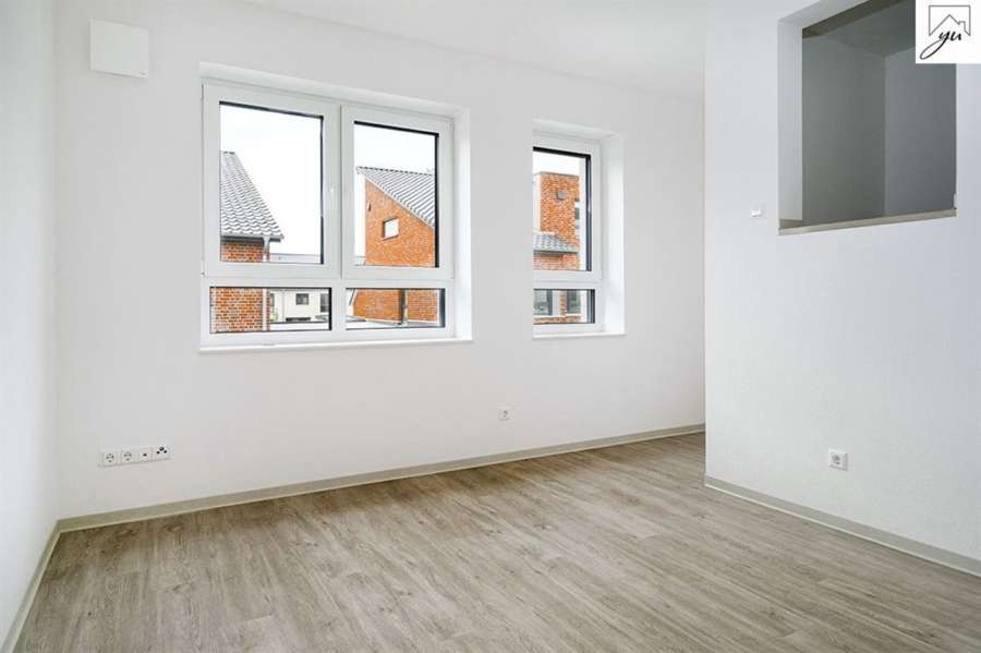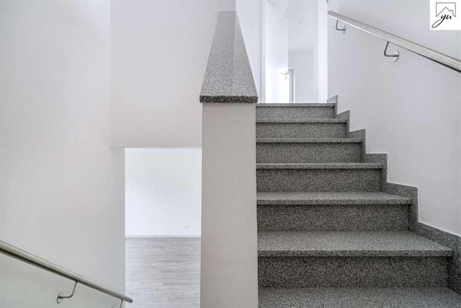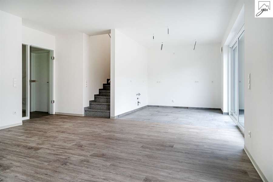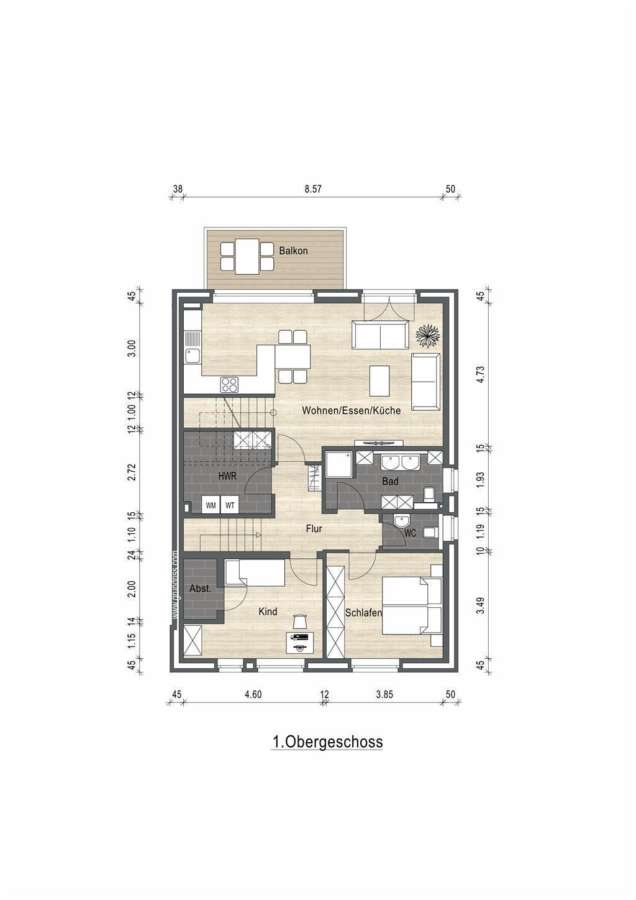 einen eigenen Eingangsbereich und Treppenaufgang, ein Kinderzimmer, ein Schlafzimmer, ein Gäste- WC, ein Badezimmer mit Badewanne, ebenerdiger Dusche und Doppelwaschtisch, einen praktischen Hauswirtschaftsraum mit Anschluss für die Waschmaschine und einer offenen Küche mit integriertem großzügigen Wohn- und Essbereich, von welchem Sie den sonnigen Balkon erreichen im Obergeschoss.