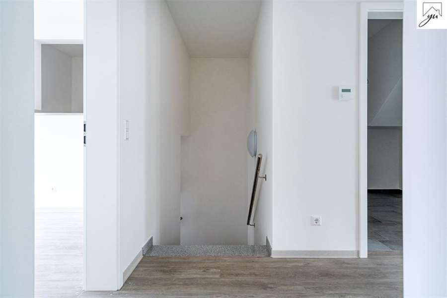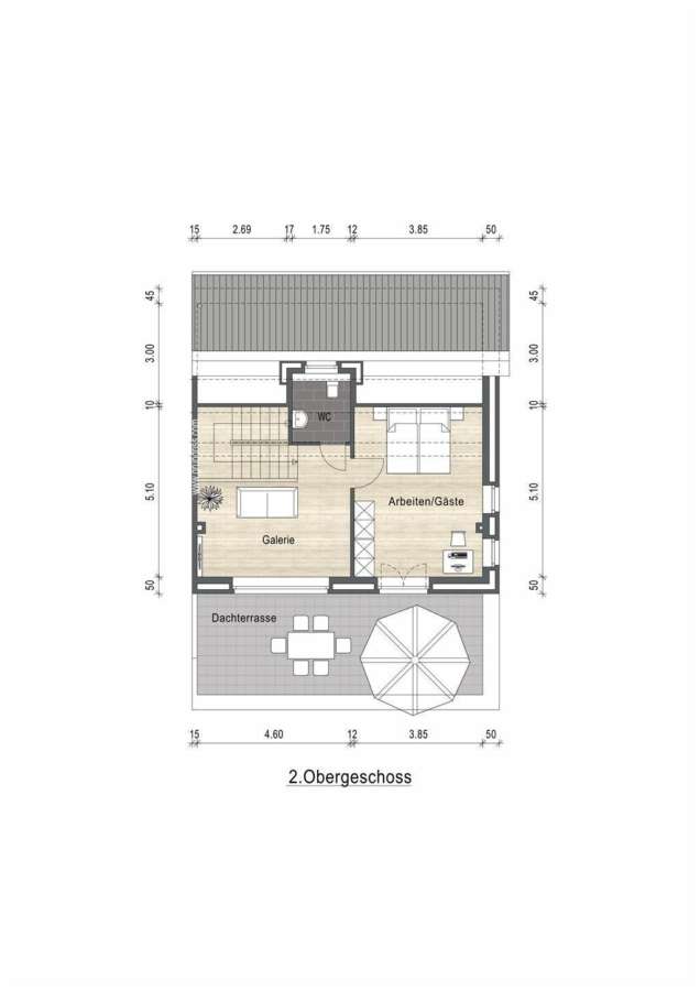 Vom offenen Wohn- und Essbereich erreichen Sie das Dachgeschoss. Hier befindet sich ein Büro und ein weiteres Zimmer sowie eine Toilette. Von beiden Dachgeschosszimmern ist die wunderschöne, große Dachterrasse zu erreichen.