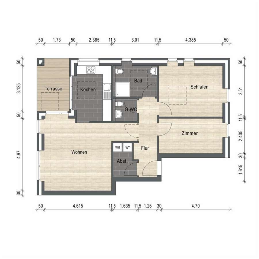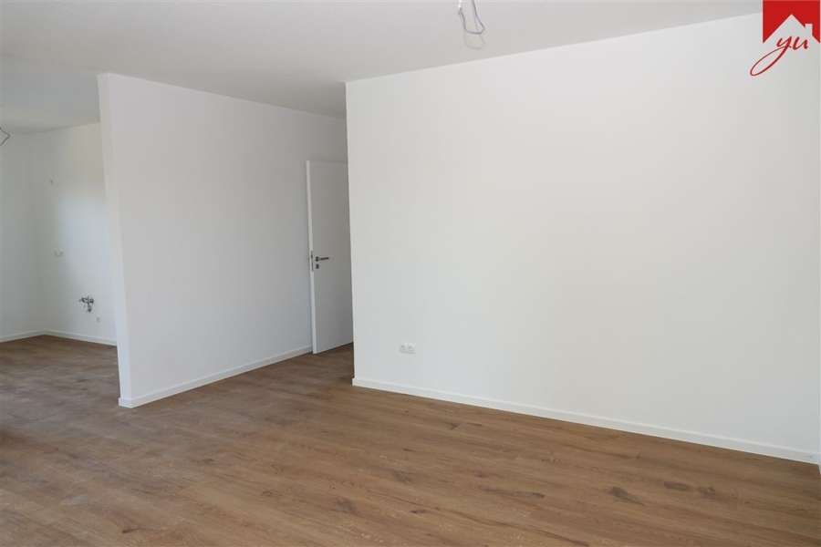 Aufgeteilt ist die Wohnung in einen Wohnungseingangsbereich, eine offene Küche mit leicht abgetrenntem Wohn- und Essbereich und Zugang zum Balkon, ein Schlafzimmer, ein Gästezimmer oder Büro, ein Badezimmer mit Dusche, ein Gäste-WC und einen Abstellraum mit Waschmaschinenanschluss.
