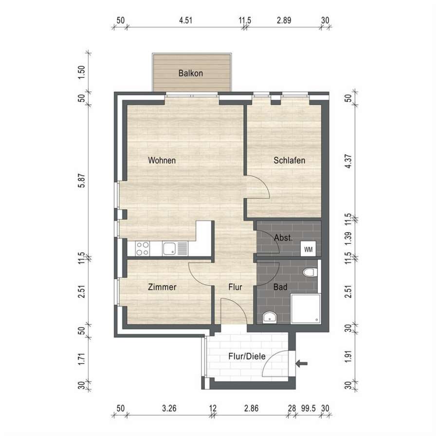 Aufgeteilt ist die Wohnung in einen Wohnungseingangsbereich, eine offene Küche, ein Wohn- und Esszimmer mit Zugang zum Balkon, ein Schlafzimmer, ein Gästezimmer oder Büro, ein Badezimmer mit Dusche und einen Abstellraum mit Waschmaschinenanschluss.